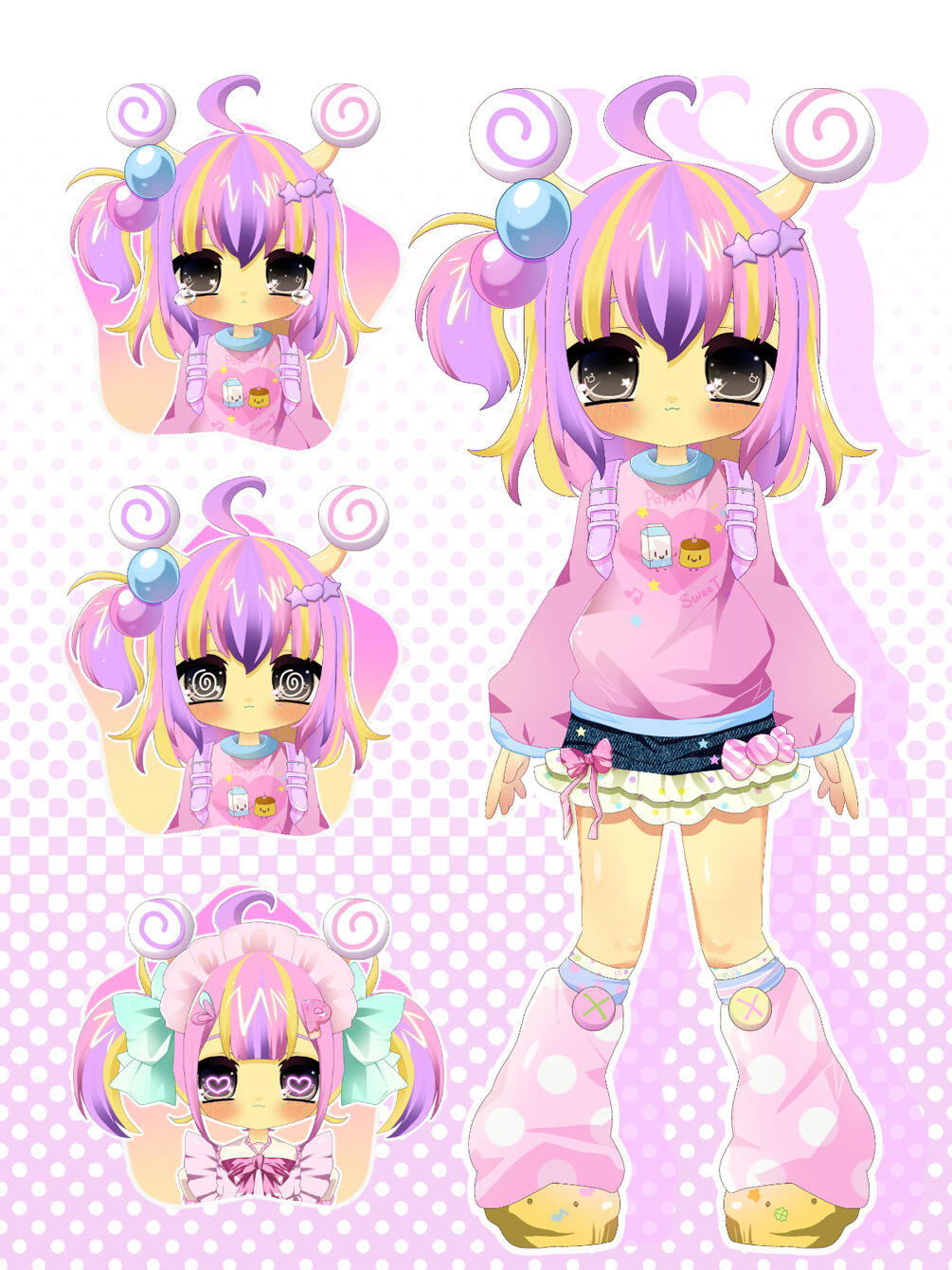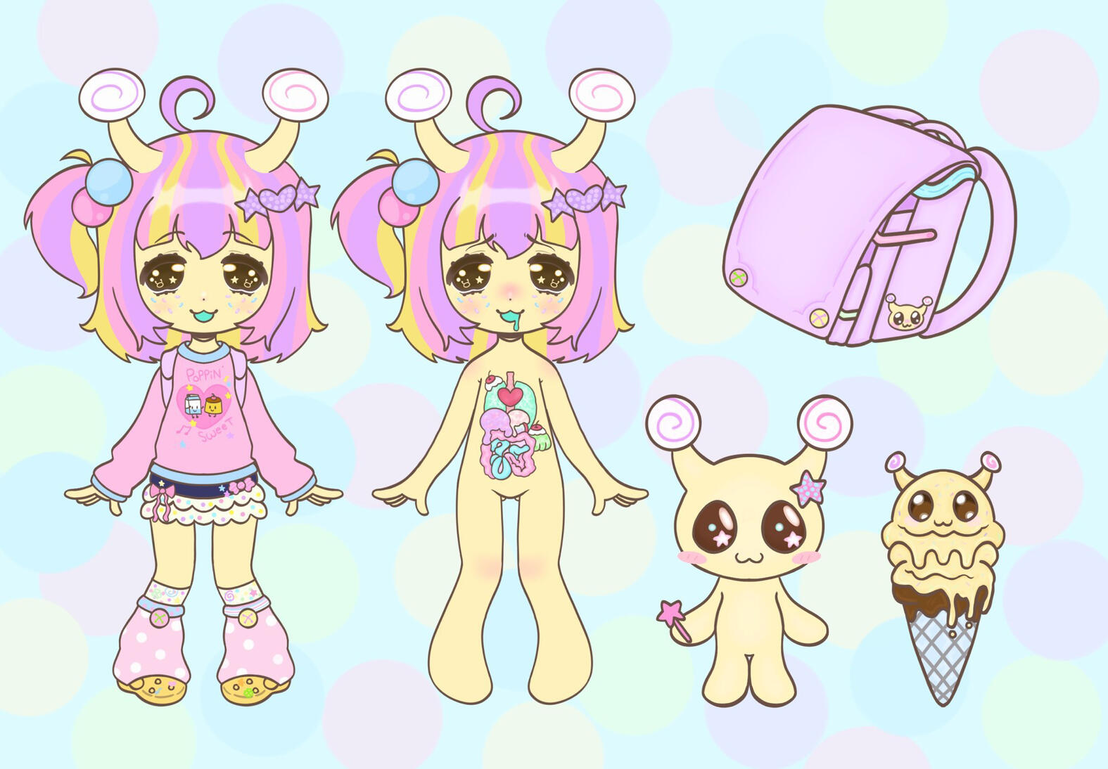 ☆ alien bug from outer space ☆ made of candy & eats sweets to regenerate ☆ also eats stickers & stationery ☆ can’t be killed, but can be melted ☆ wishes to be an idol, so took a job at a maid cafe ☆ not good at singing or dancing ☆ sprite puni hinds in their randoseru ☆ sprite is a detached part of puni ☆ can be found in their room, candy store, or an an underground idol show ☆ interest in heisei kawaii & moe culture ☆ likes when friends want to snack on them ☆ deredere, hime complex, big sister type ☆